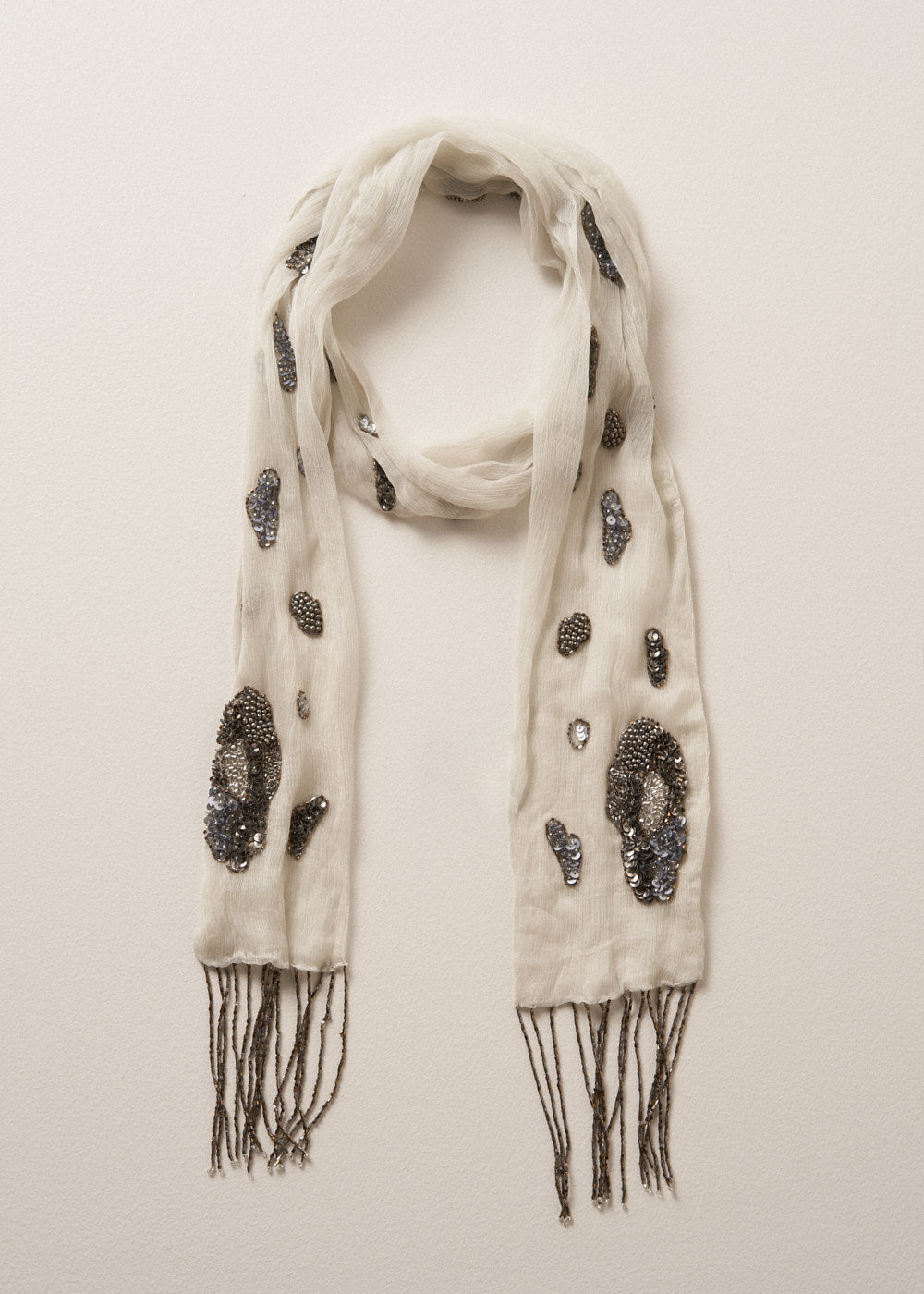 An elegant take on vintage-inspired sparkle, the Alison Scarf is delicately embellished with metallic beads and sequins, offering subtle shimmer and a softly tactile finish. It’s the perfect piece to elevate evening looks or bring a touch of quiet glamour to everyday layering.