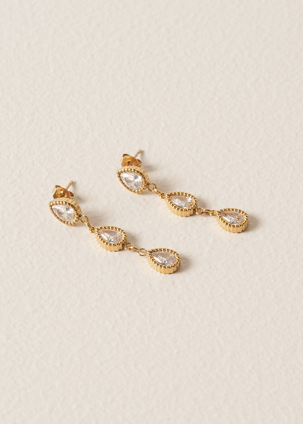 The Althea Earrings feature three cascading teardrop crystals. With a stud fastening, tiered, suspended design and finished in a beautifully glistening gold, they provide sparkle and a touch of opulence.