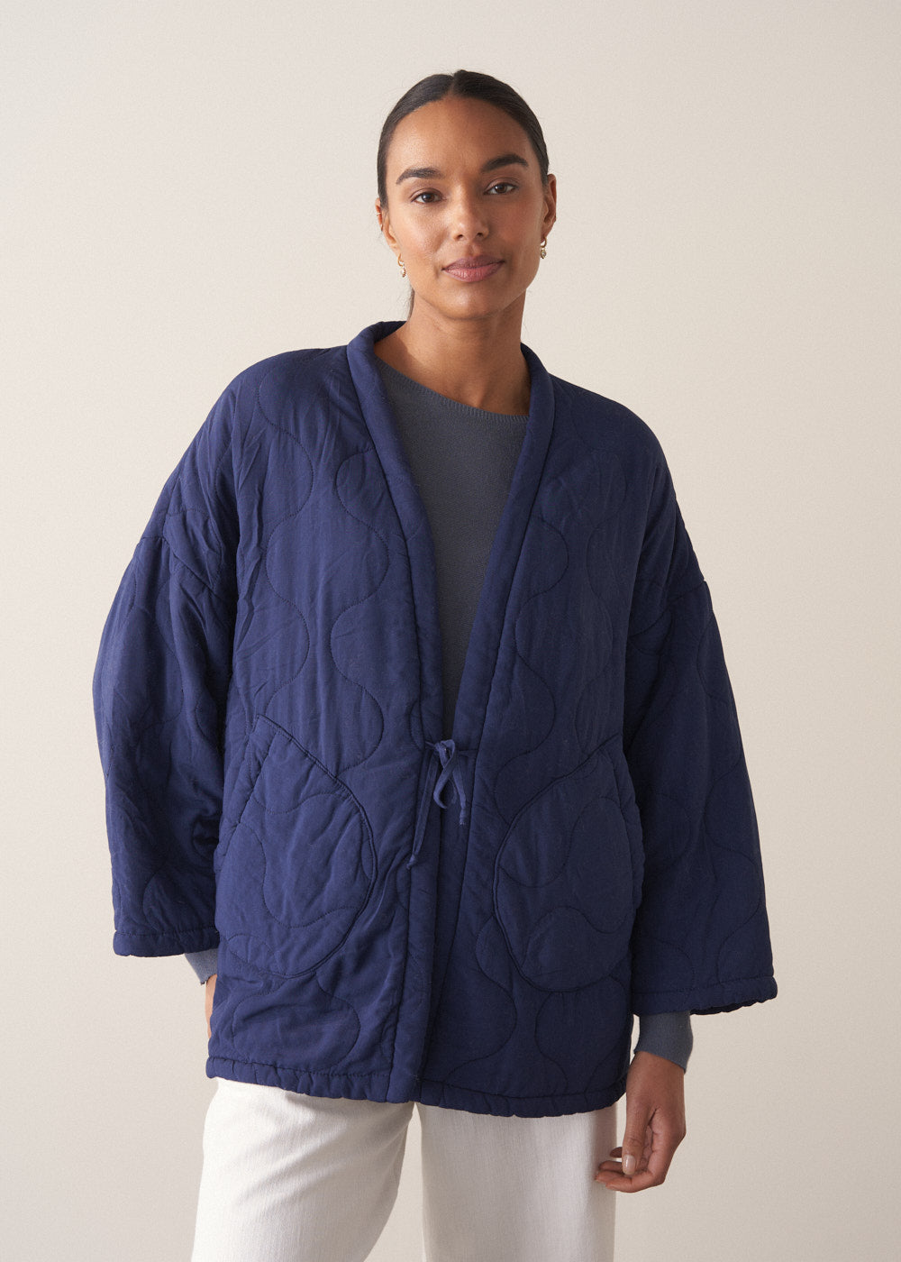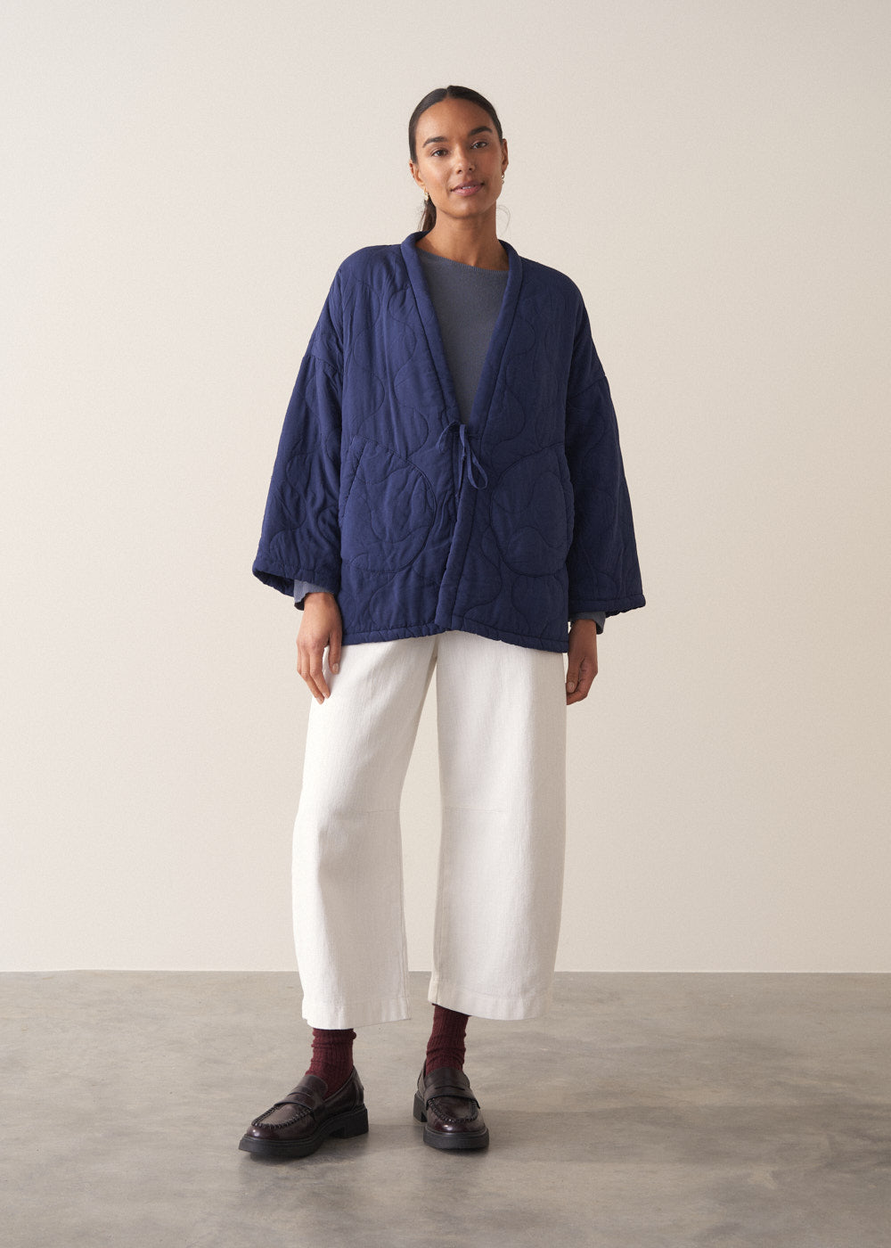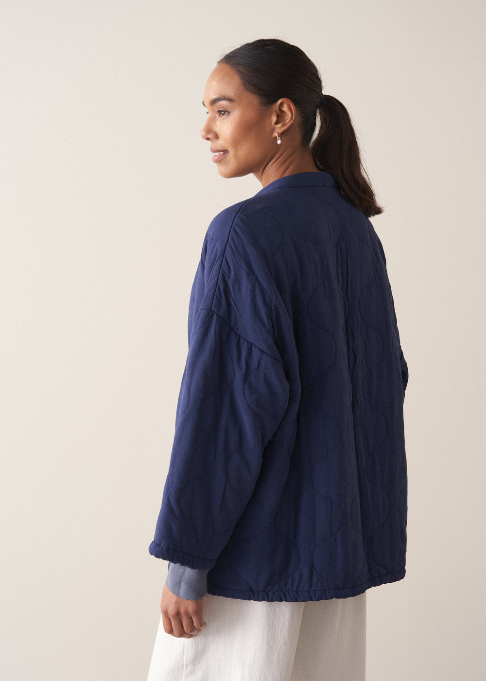 The Annelie jacket, featuring a cosy quilted design and versatile boxy silhouette is a chic wardrobe essential for cooler seasons. Its elegant navy blue hue and wide, loose-fit sleeves make it ideal for layering over chunky knits to create a sophisticated and warm layered look