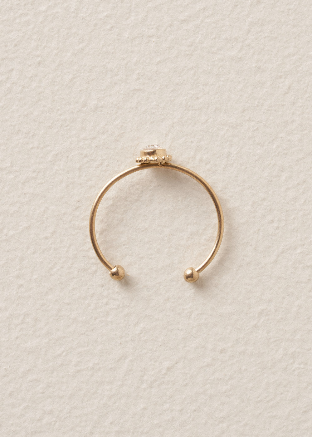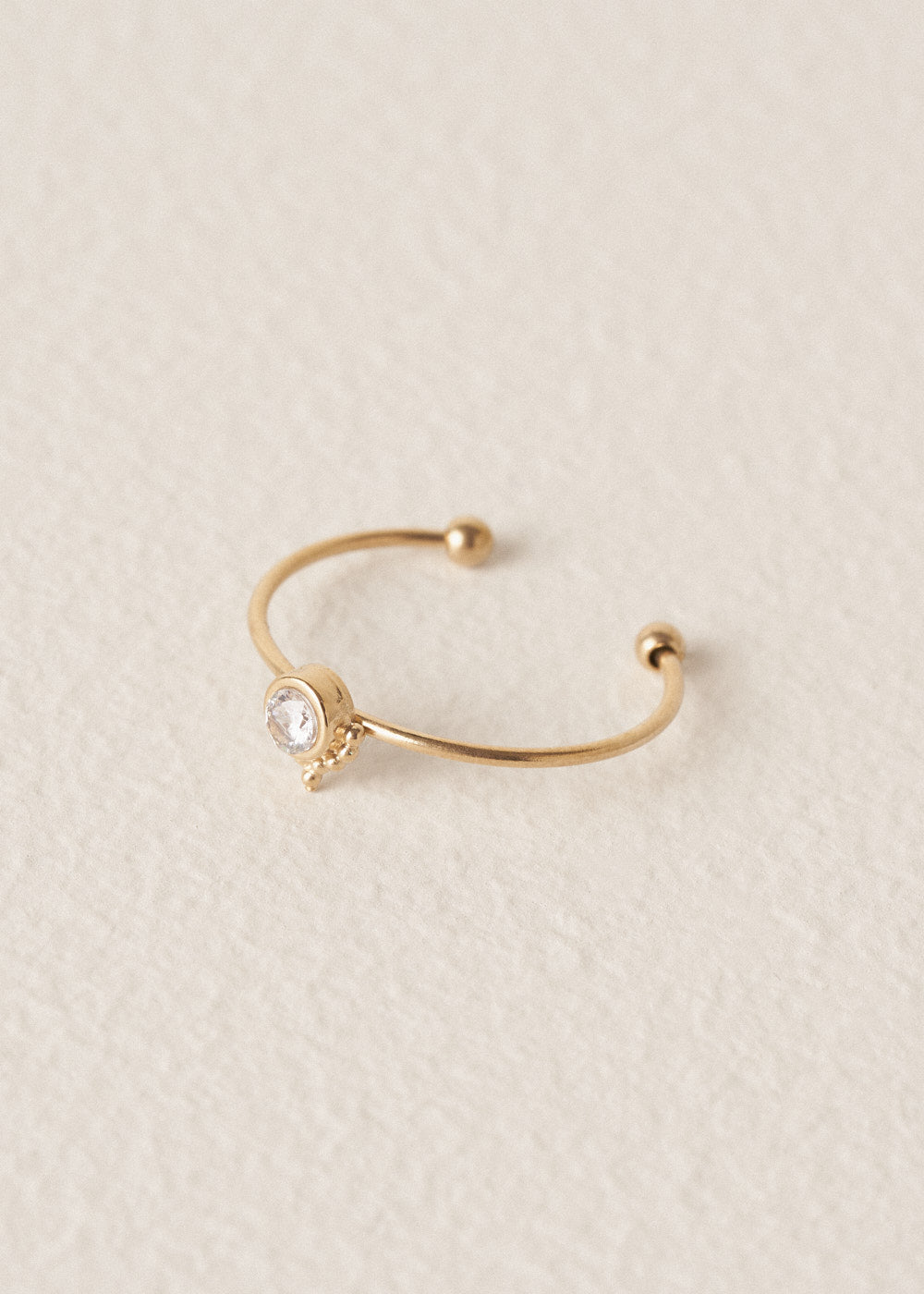 The Basil Ring features a slender gold band, a twinkling clear crystal at the centre, accented with delicate balled detailing. Subtle yet striking, it’s a refined finishing touch.