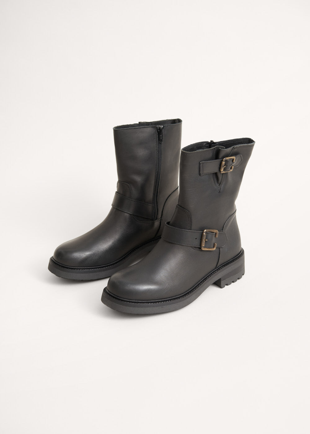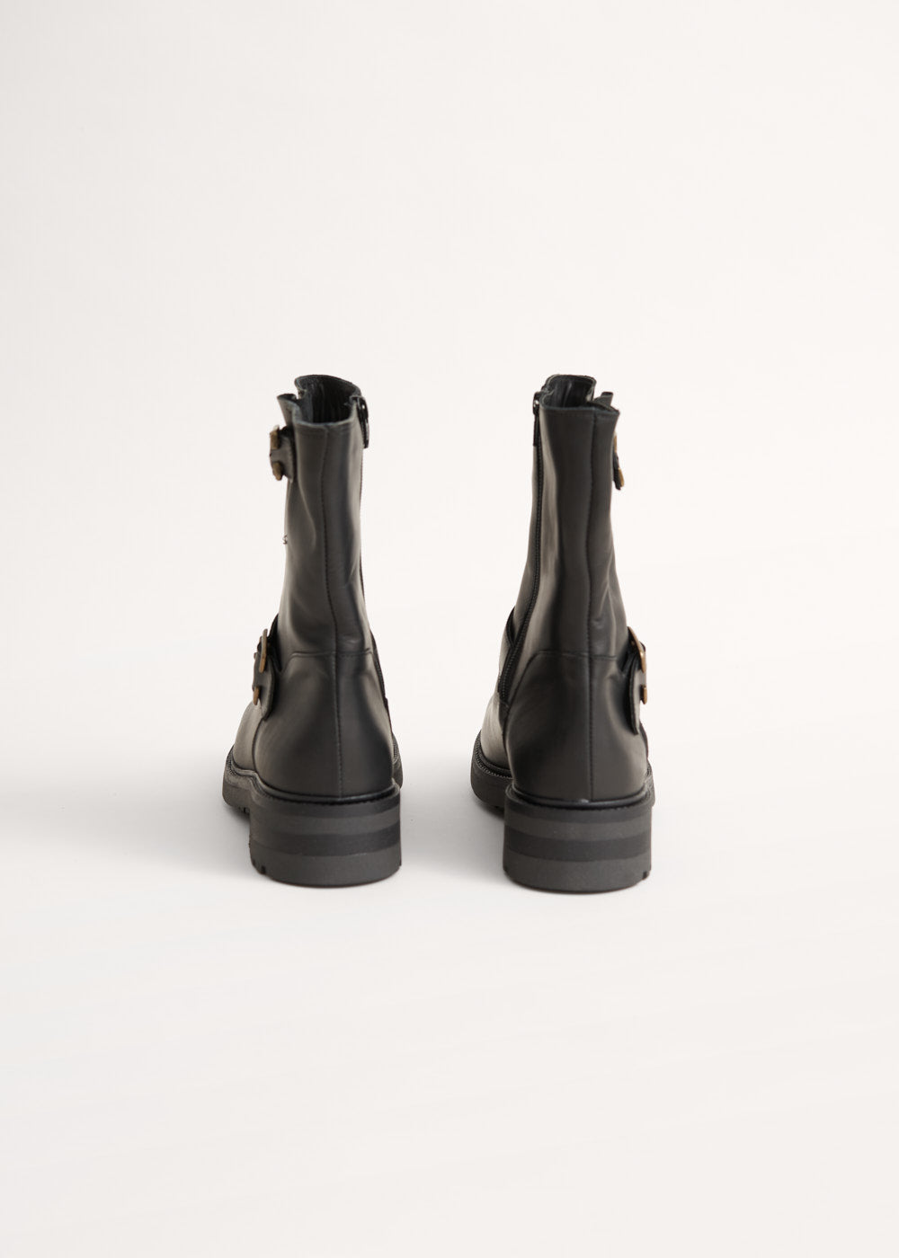 Made in Italy and crafted from durable leather, the black leather Biker boots feature two adjustable gold buckle straps and an above-the-ankle design. A convenient side zip allows for effortless on-and-off wear, making them as practical as they are timeless.