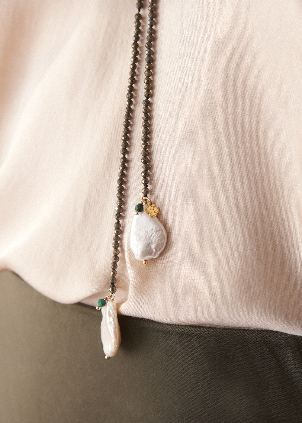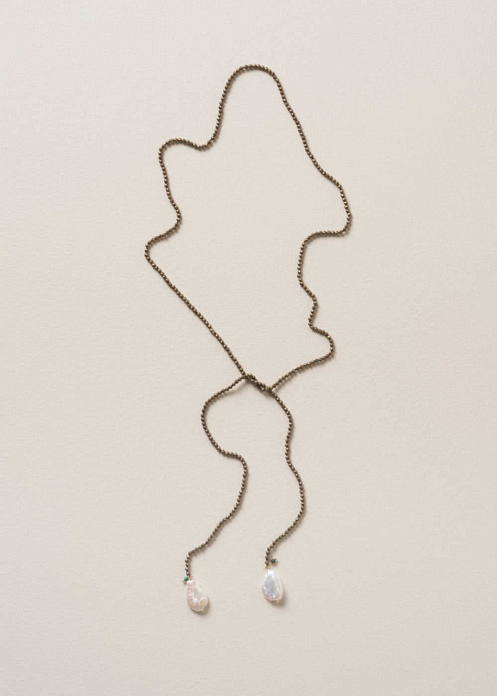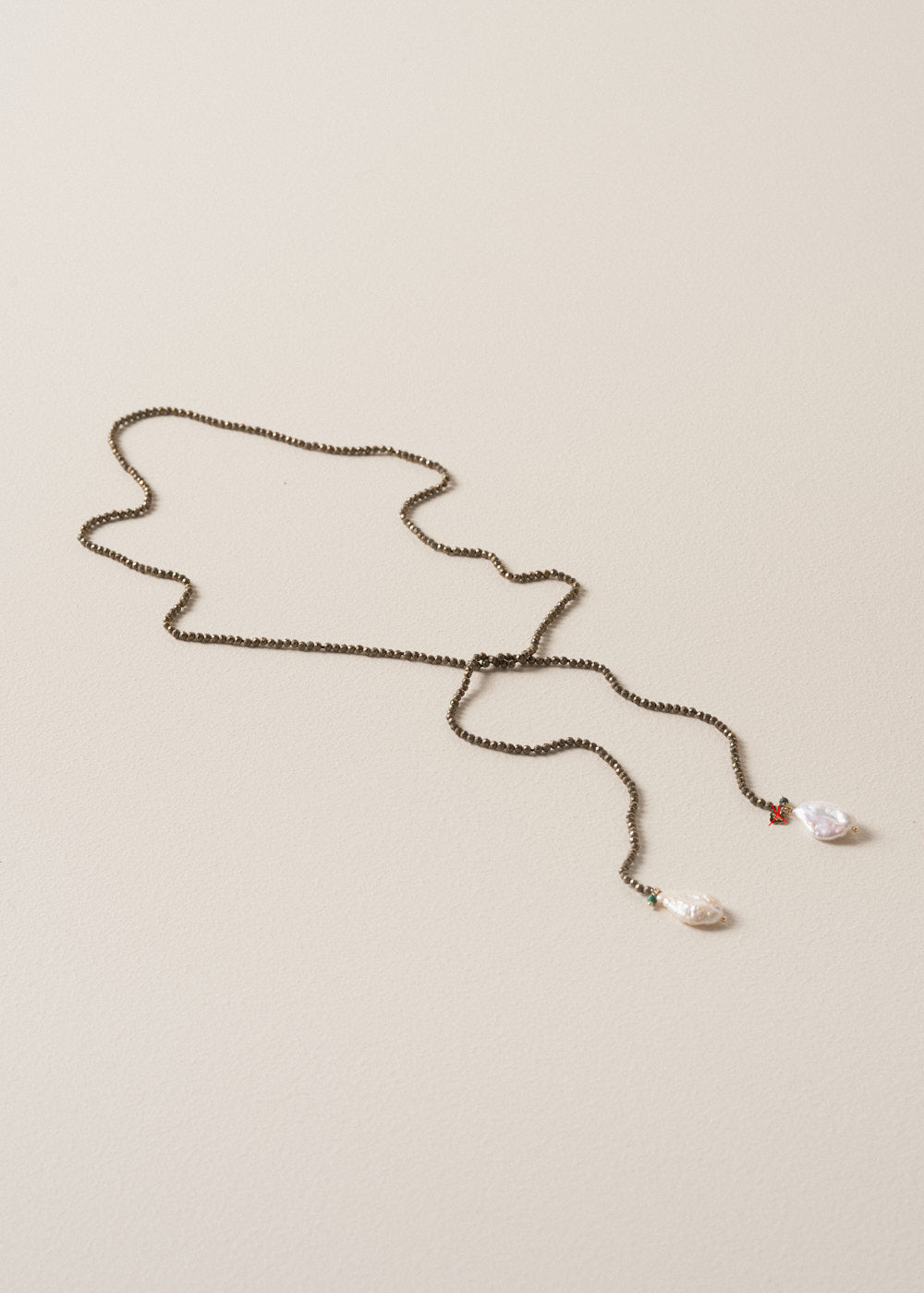 The Blythe Necklace features a collection of iridescent, faceted beads and chunky, freshwater pearls. With an open design, it can be gracefully tied to create a classic lariat look or draped effortlessly to add some statement sparkle.