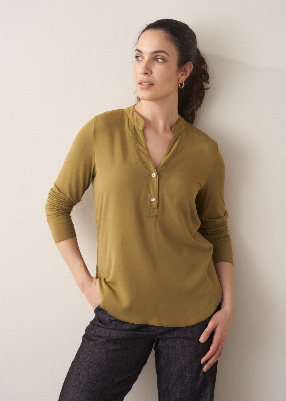 A cross-seasonal staple, the versatile Candice Top, with its slim fit and soft jersey sleeves, can be worn as a stand-alone blouse or a fuss-free layering piece.