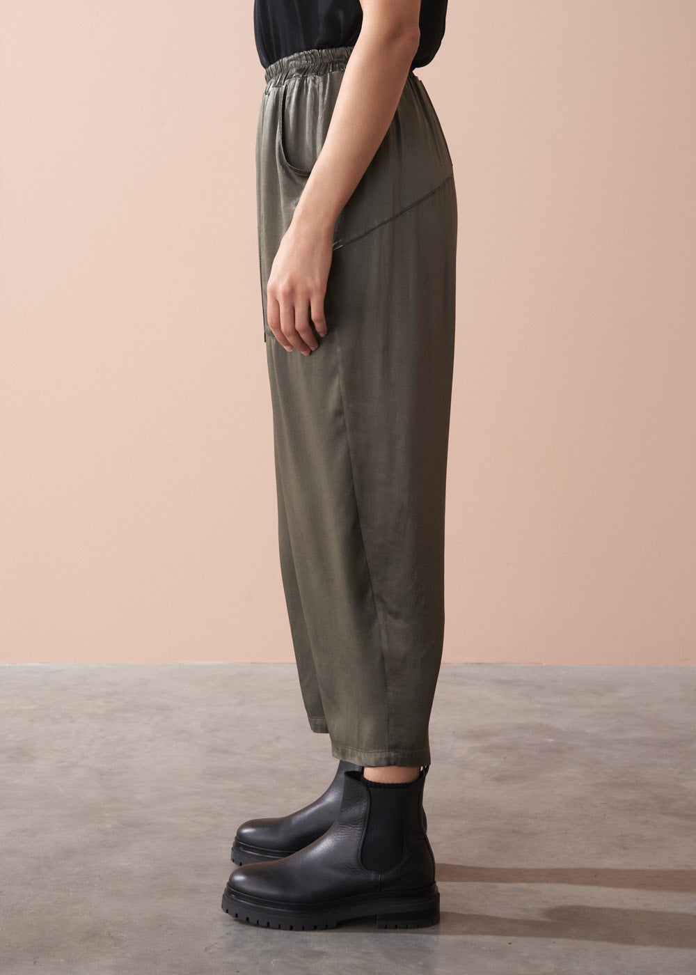 Crafted from sublimely soft satin in a rich khaki green, the Cypress Trouser offers a refined take on the classic cargo. A tapered silhouette provides structure, while a luxurious finish and all-day comfort balance subtle utilitarian details.