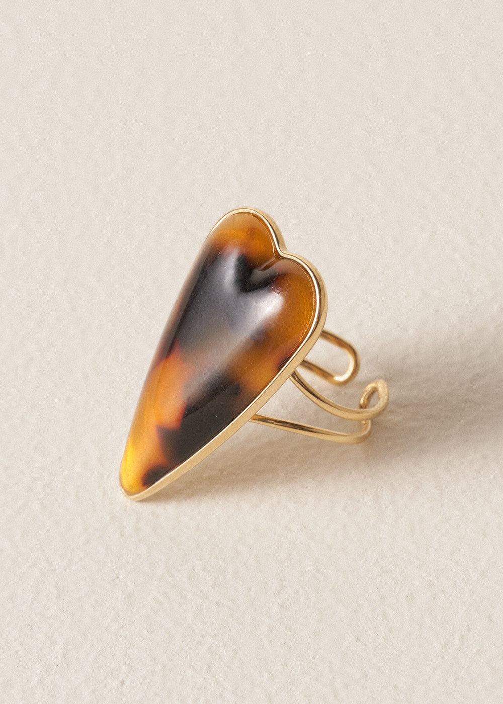 Providing a bold, statement finish with a subtle pattern, the Elowen Ring features an oversized tortoiseshell heart on an adjustable gold band.