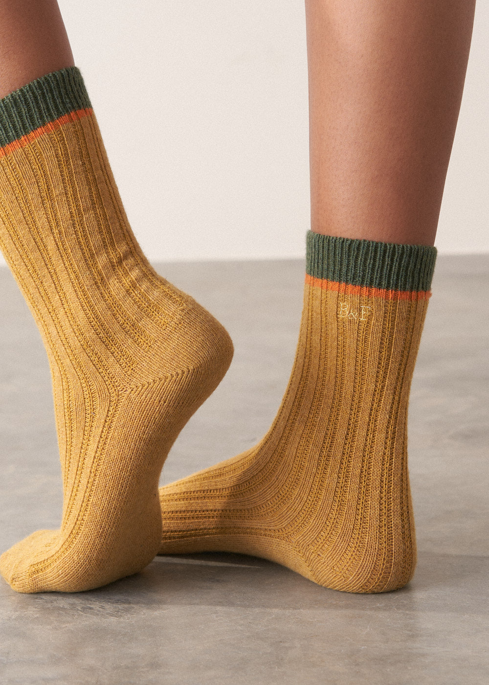 Give your toes a treat with the Ember Socks. Made from a heavy knit recycled wool blend, they’re designed for both warmth and softness. Finished in a mustard yellow with a retro orange and green stripe at the ankle. A touch of metallic thread highlights the embroidered B&F monogram, offering subtle sparkle with every step.