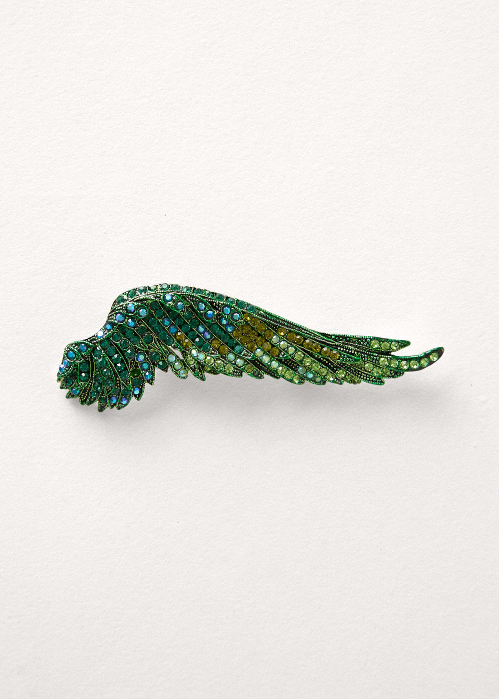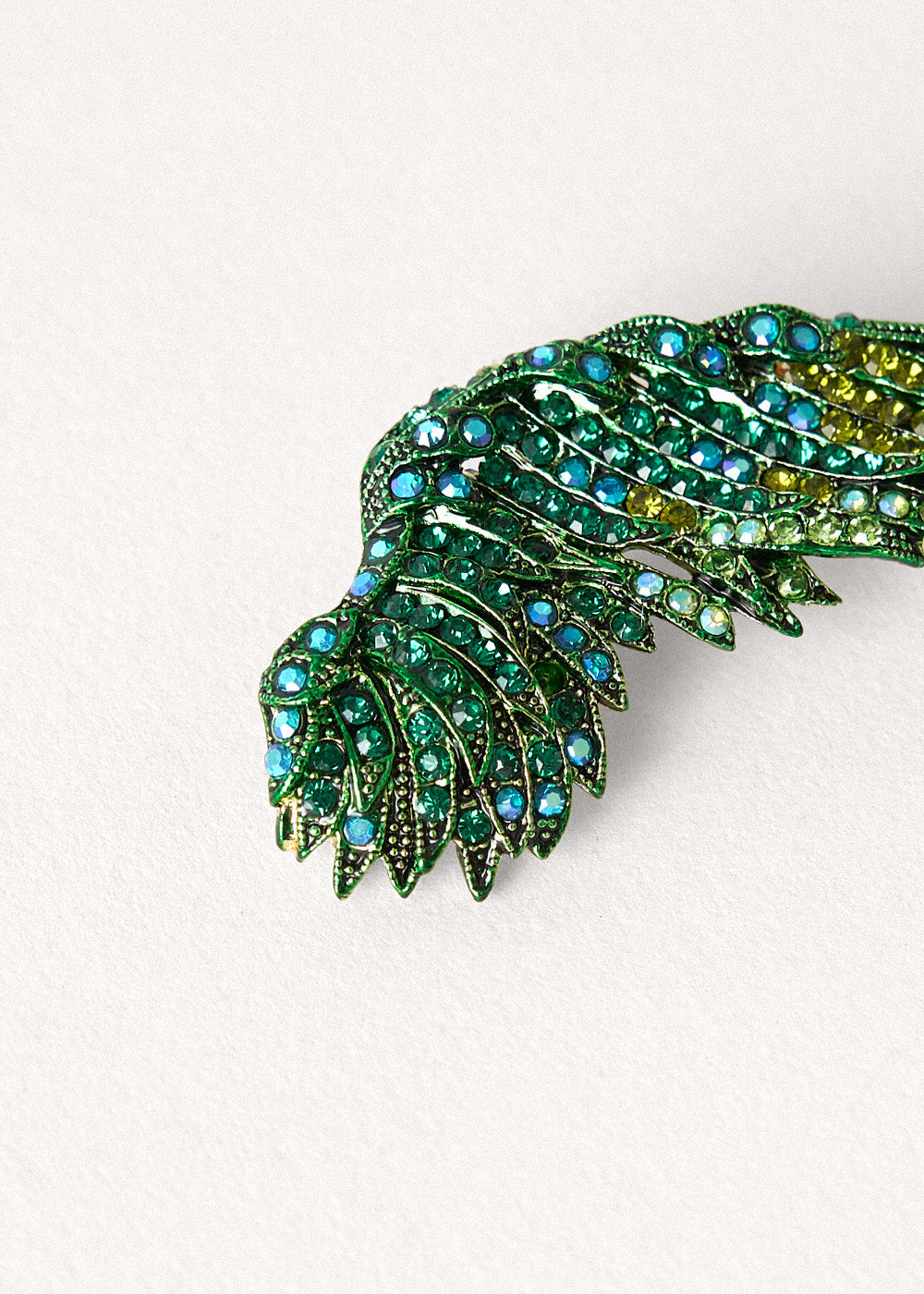 Exuding brilliance from its plethora of green, yellow and blue crystals, the striking Feather brooch is a true statement piece. Featuring a secure pin fastening, it promises to add a vibrant touch of sparkle to any ensemble.