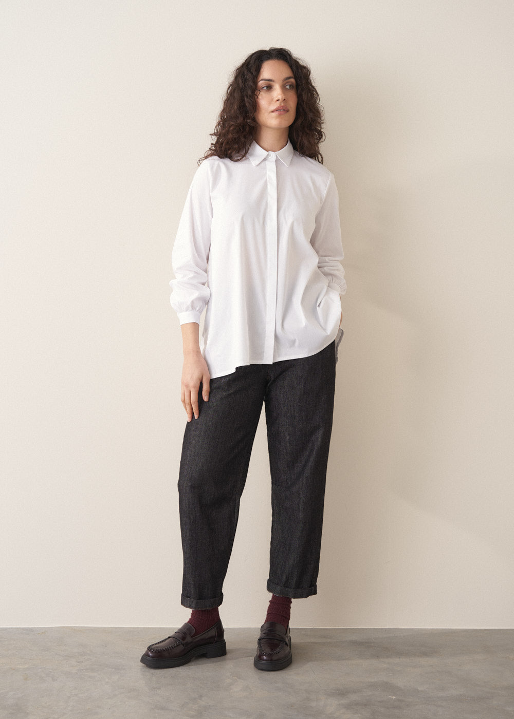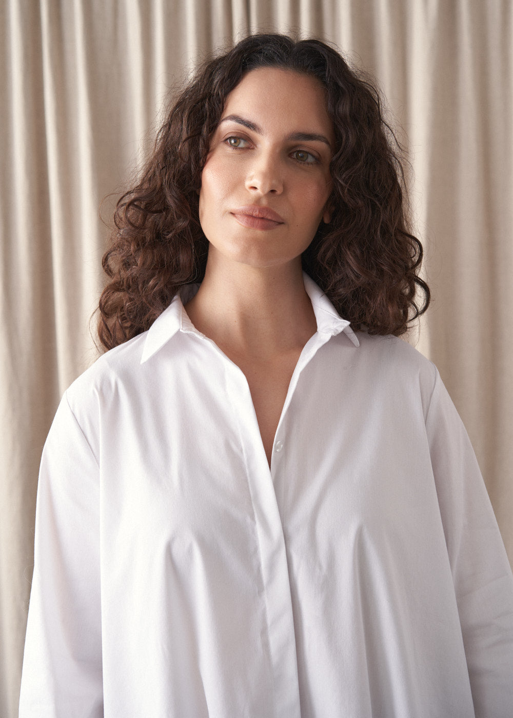 An elevated take on the classic white shirt, the Harlow features a long line silhouette and a statement, oversized fit. Crafted from fresh white cotton with a hint of stretch, it's a comfortable and versatile wardrobe staple.