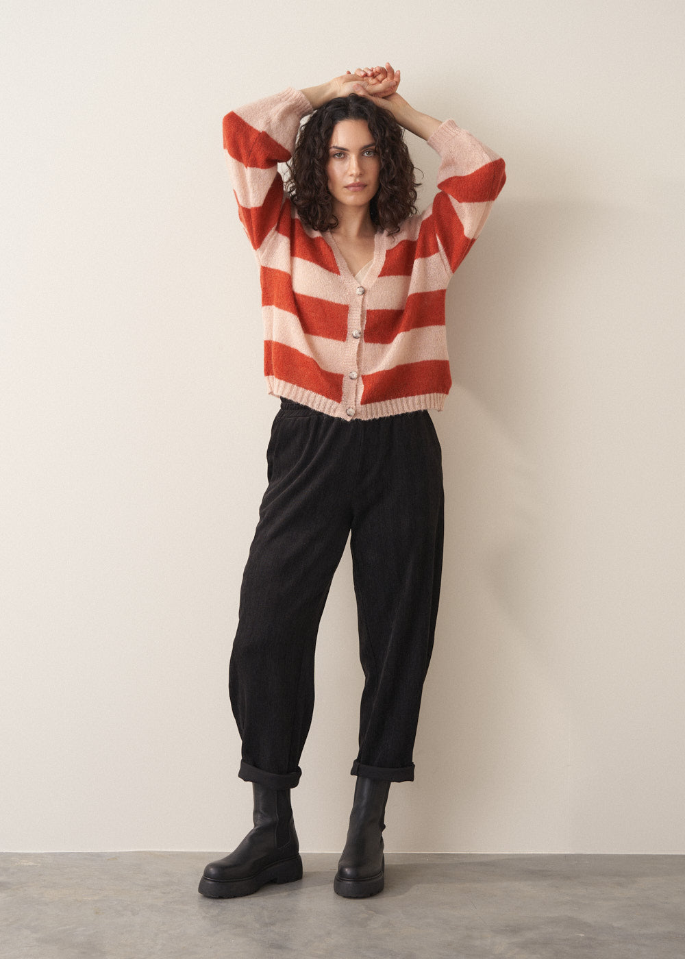 Returning in a vibrant pop of colour, the Harry cardigan is back. It's a lightweight layering piece that blends style, comfort, and cosiness with its relaxed fit, luxurious mohair blend, and striking red-and-pink stripe.