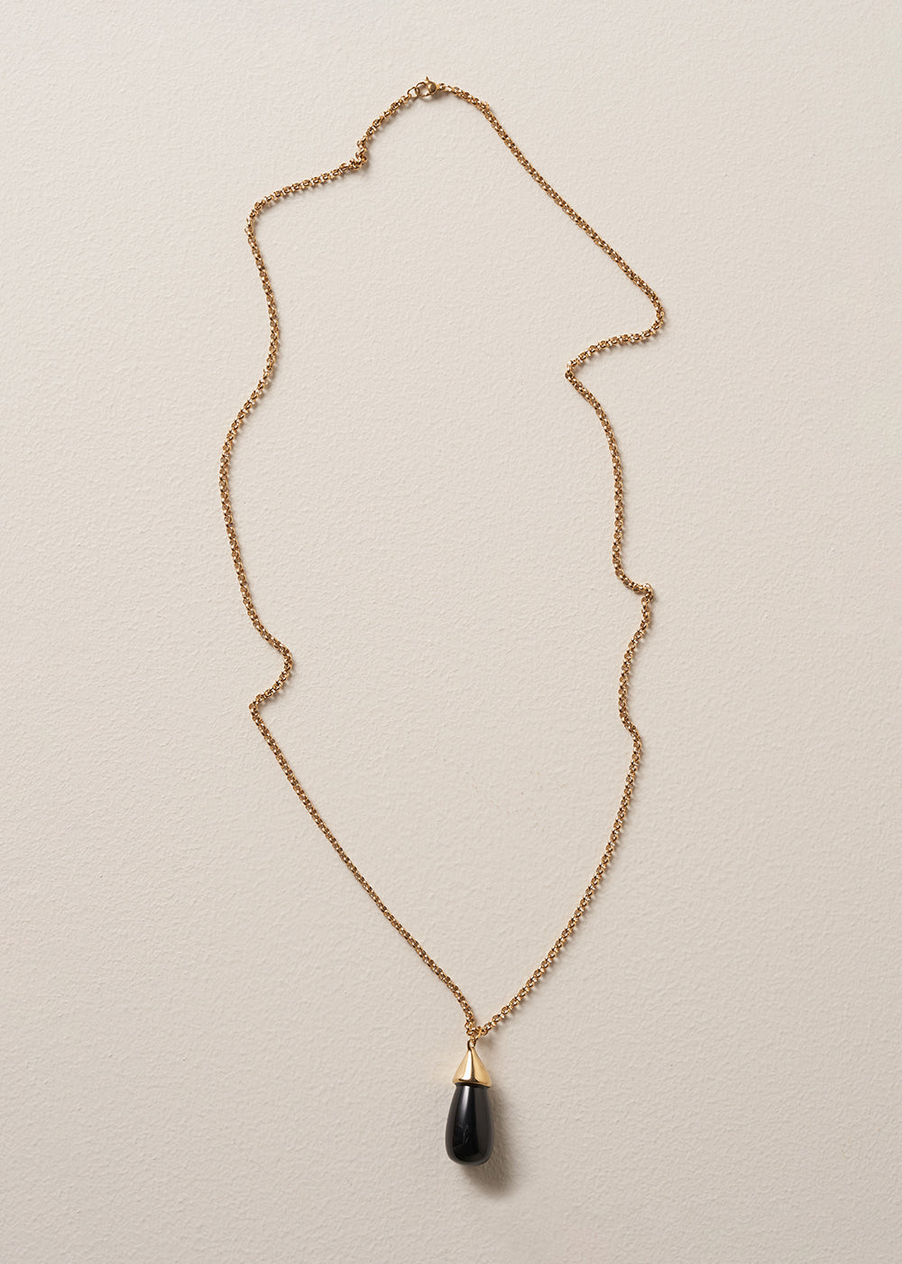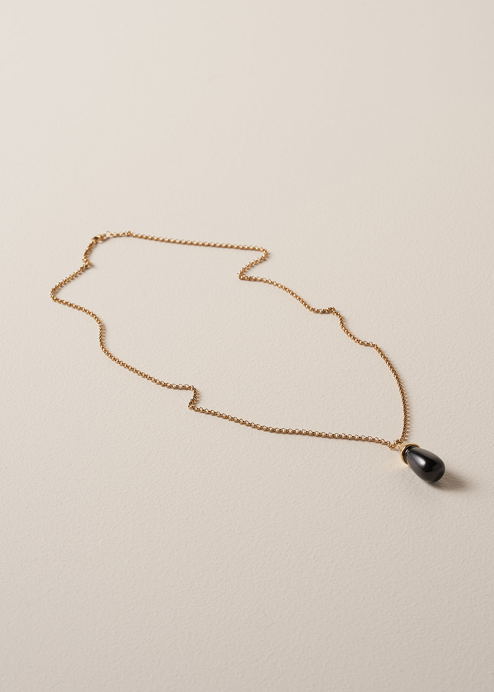 With a long, golden chain and a chunky, black oval pendant, the Hollis is a statement necklace, perfect for adding a bold, focal point to your look.