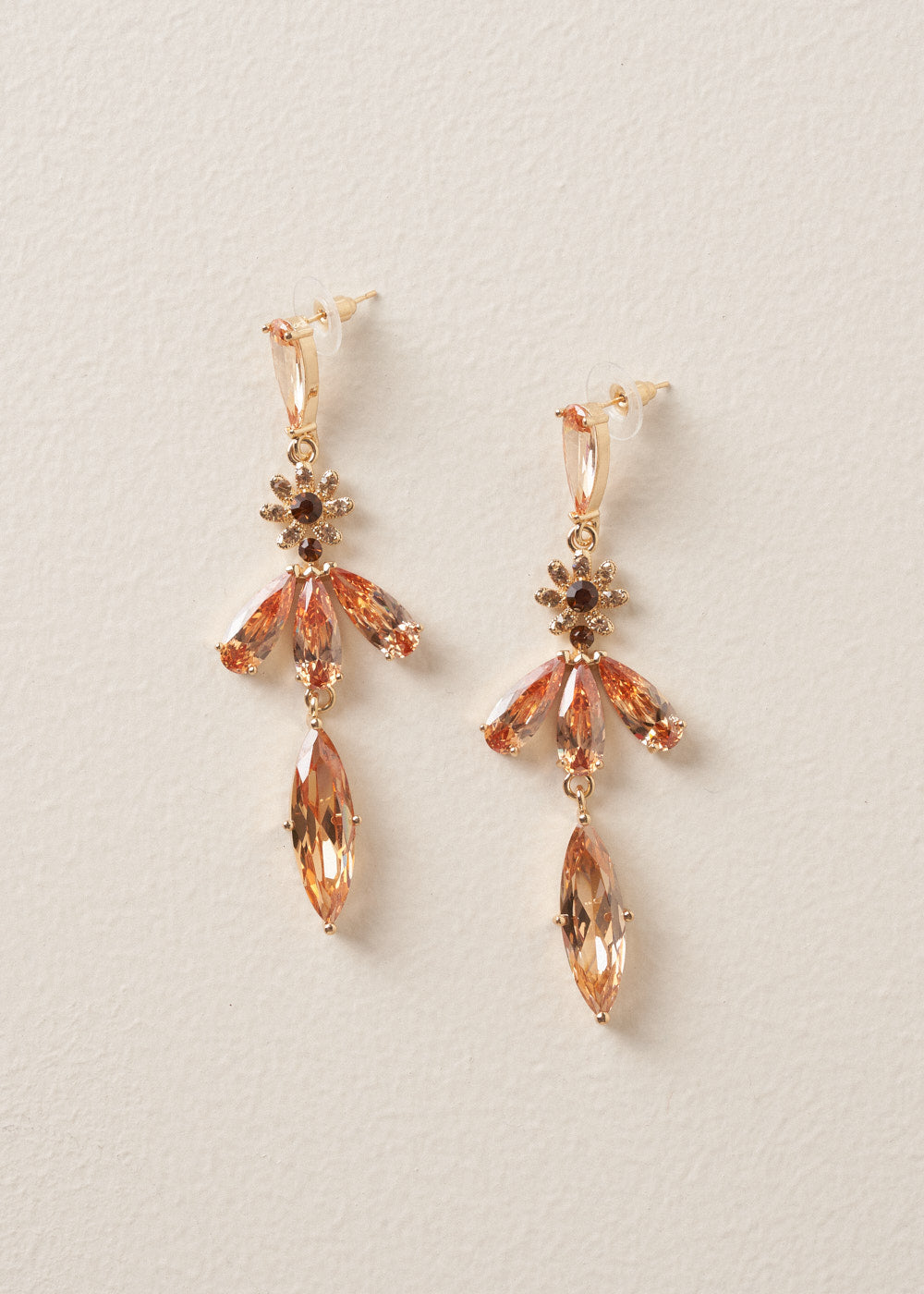 The Levi Earrings are the ultimate statement accessory. They have a cascading drop design, peach crystals and delicate floral motifs that catch the light beautifully. Perfect for adding maximum sparkle and eye-catching movement.