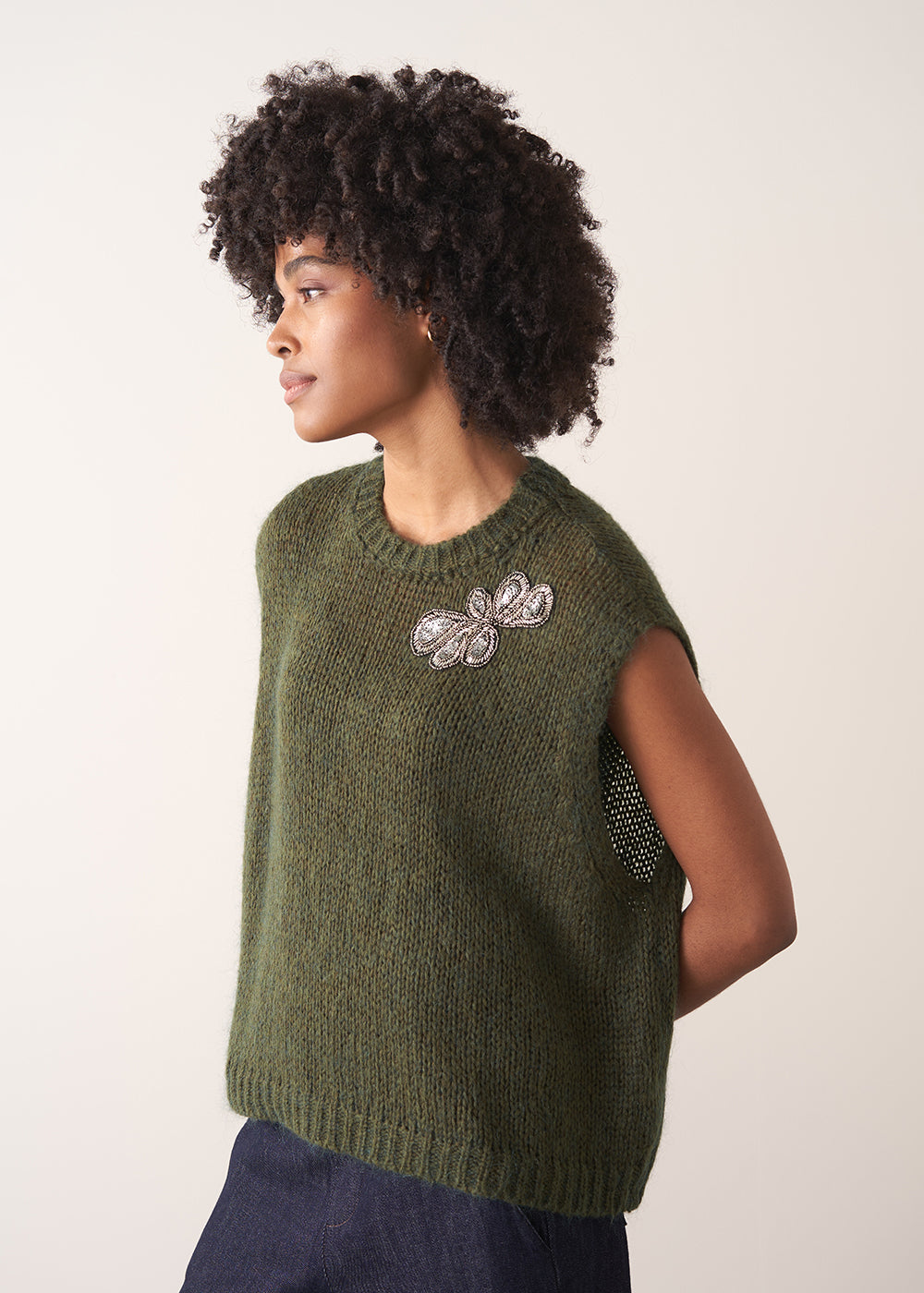 LOLA EMBELLISHED KNITTED ROUND NECK TANK - KHAKI