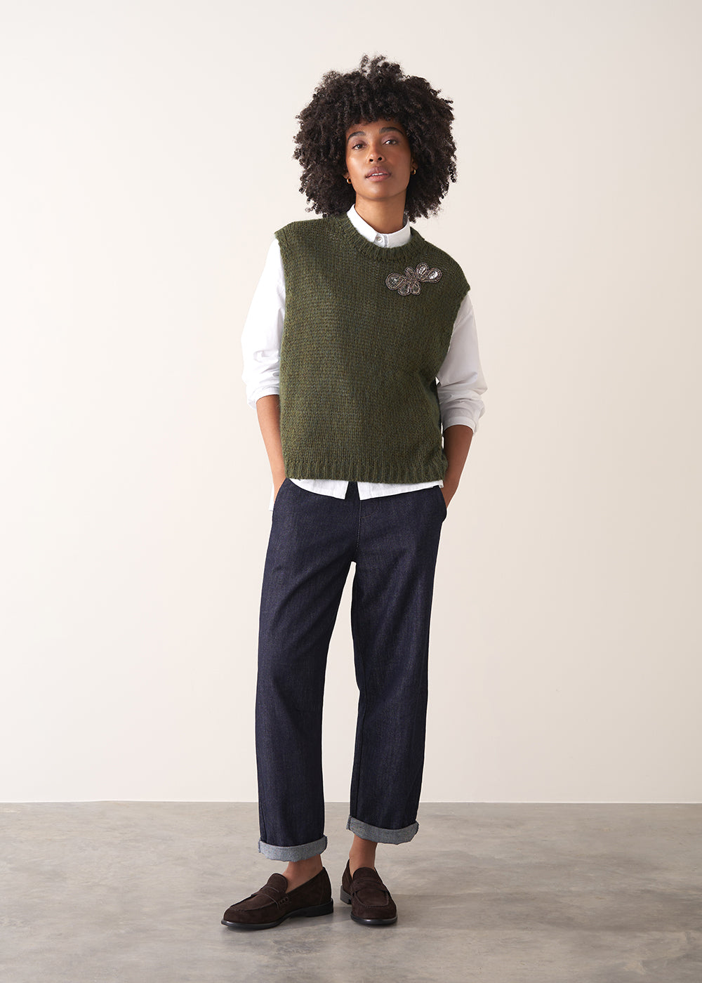 An elevated take on a Busby & Fox staple, the Lola Tank returns. Delicately embellished with silver beading to add an extra touch of sparkle, the Lola knitted tank is a versatile staple that you'll reach for year-round. Wear it solo as a sleeveless pullover knit on warmer days, or layer it over long-sleeve tops during cooler months to create a chic, textured look.
