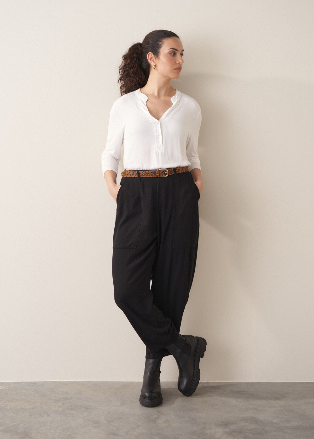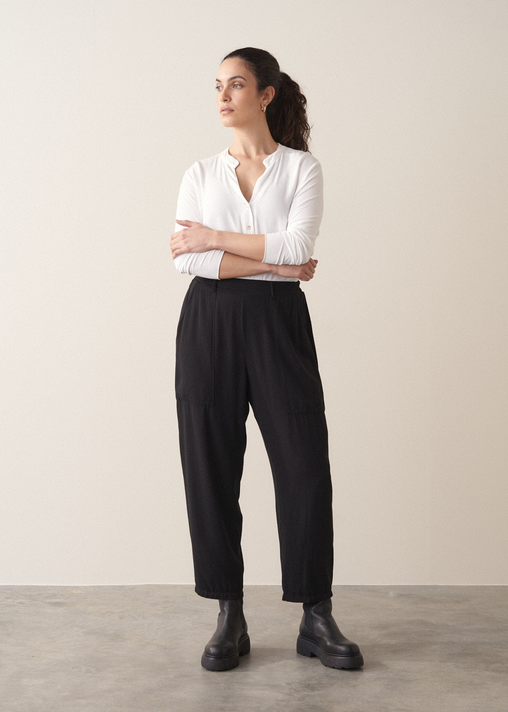 The Maple Trousers are crafted from ultra-soft viscose with a relaxed barrel-leg silhouette. Finished with an elasticated waist panel, they deliver effortless comfort and versatility.