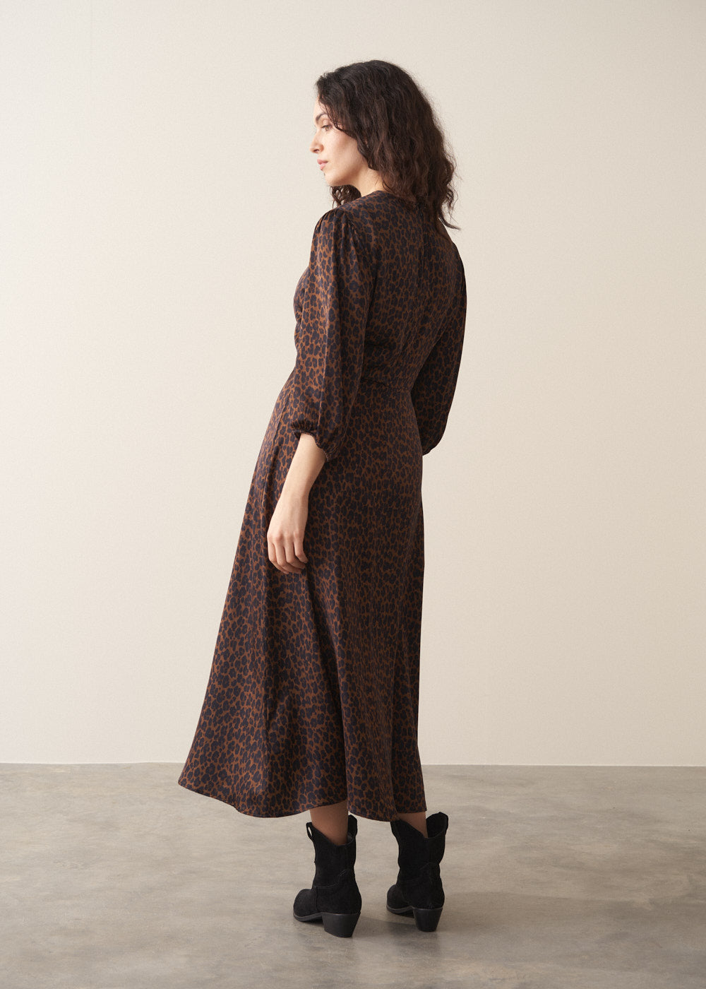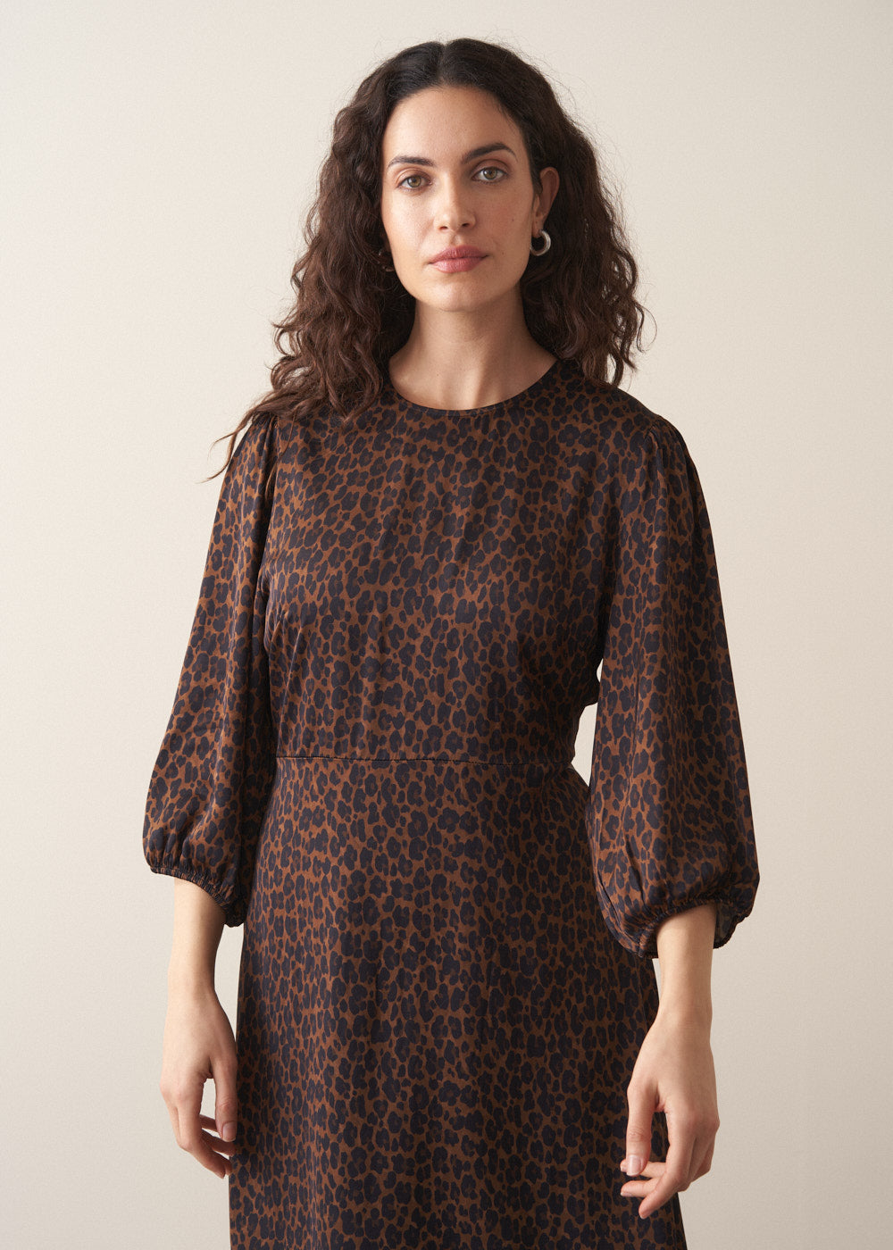 Crafted from sumptuously soft satin and finished in a rich mahogany leopard print, the Marcia Dress strikes the perfect balance between statement and sophistication. With an elegant midi length, round neck and 3/4 blouson sleeves, it’s a standout piece that transitions seamlessly from day to night.