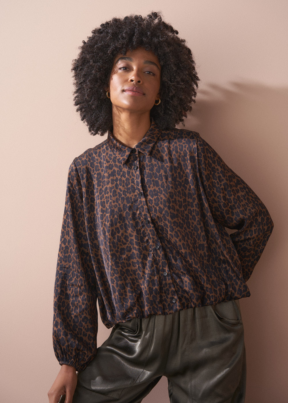 The Noah Shirt is crafted from silky satin and features a bold leopard print pattern. The boxy silhouette is elevated by a sculptural bubble hem that creates a statement shape and volume.