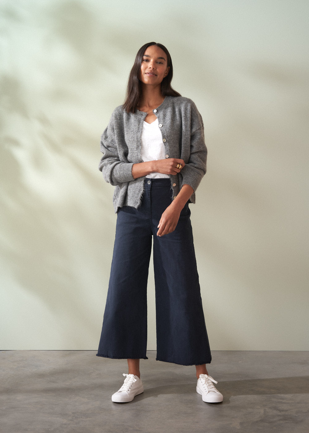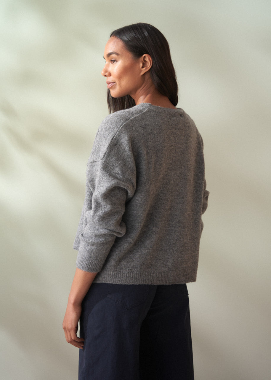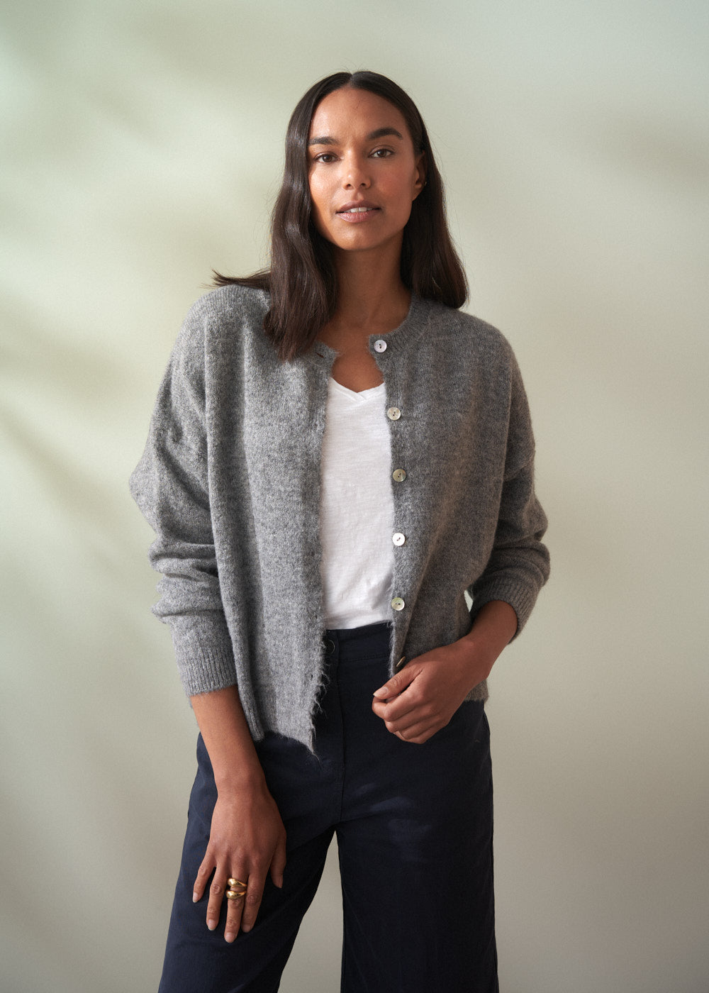 A luxe layer you'll wear on repeat. Crafted from a sumptuous wool blend in a versatile grey hue, the Ollie Cardigan is finished with iridescent mother-of-pearl buttons for a subtle touch of polish.
