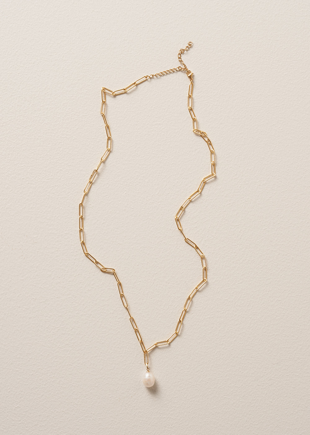 The Ottilie Necklace features a long, interlocking gold chain beautifully finished with an iridescent freshwater pearl pendant.