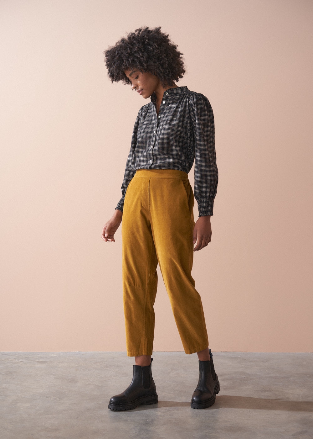 Finished in a rich mustard yellow and crafted from soft corduroy, the Pru Trousers strike a balance between structure and comfort. A gently tapered leg adds subtle shape, while the elasticated waistband offers ease and wearability for everyday styling.