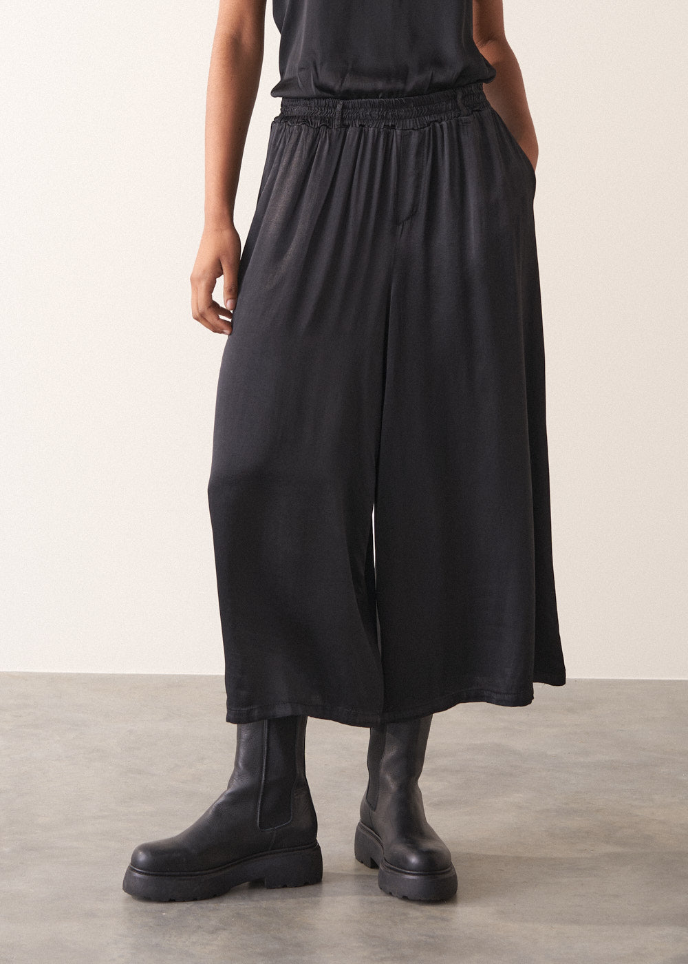 The Samira Trousers are crafted from a lustrous satin and feature an elegant wide-leg silhouette. Finished in a versatile jet black, they have drapey, cropped length and an elasticated waistband.