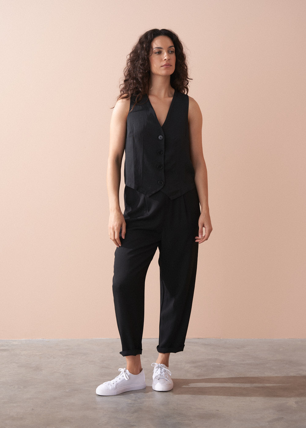 • Highly versatile, it can be worn buttoned up as a sleek, sleeveless top or styled open over other layers