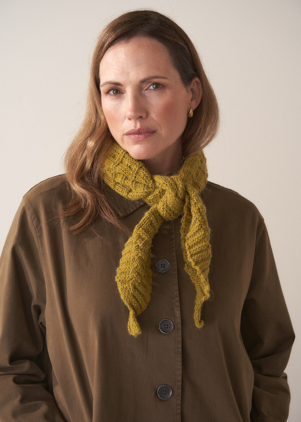 Crafted from a soft wool blend in a vibrant olive hue, the Trudi Scarf is your go-to for effortless, cosy layering. The triangular shape lends itself to endless styling; wear it knotted at the neck for a polished finish, or drape it as a classic bandana.