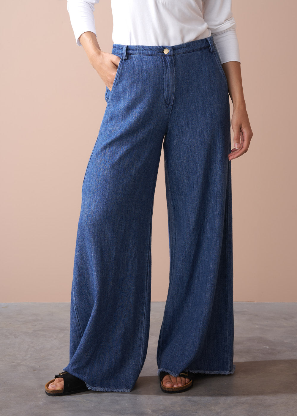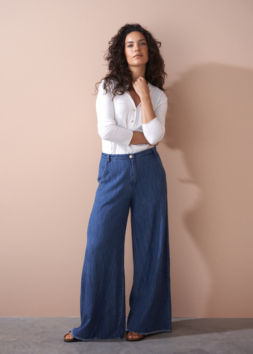 Wide-leg and full-length in a classic denim blue, the Willow Trousers are a staple in your wardrobe. Expertly crafted from ultra-soft cotton with a comfortable elasticated back waistband, these trousers merge the relaxed ease of cotton with the enduring style of timeless denim, finishing with a striking silhouette.