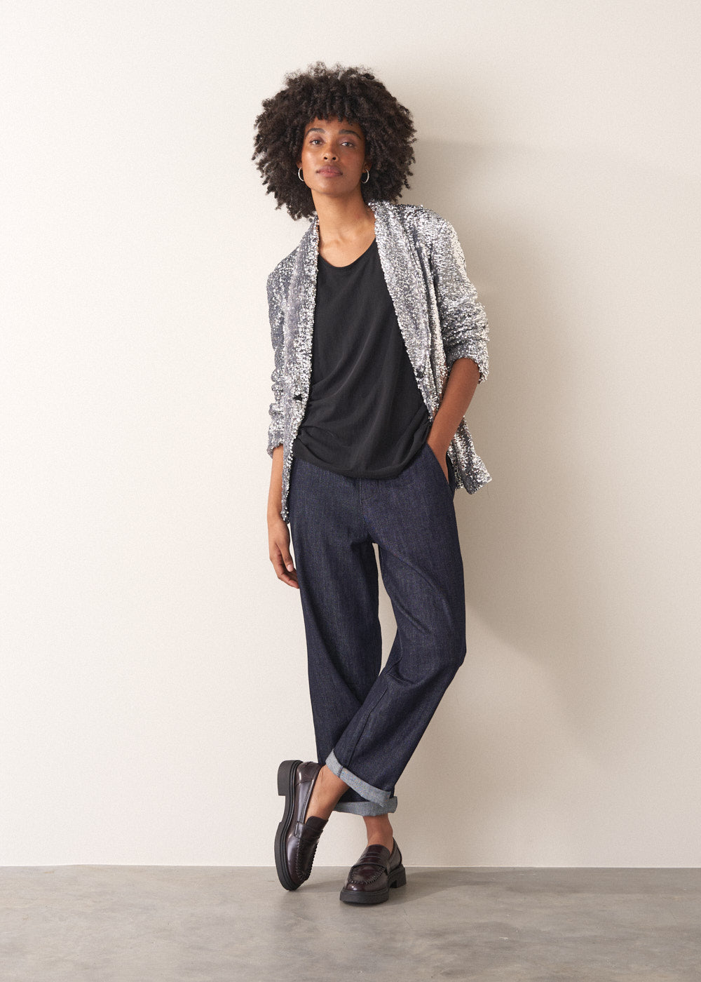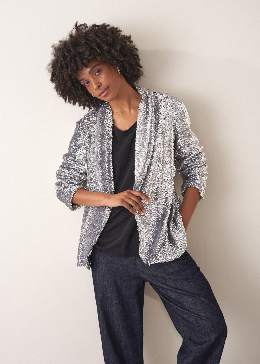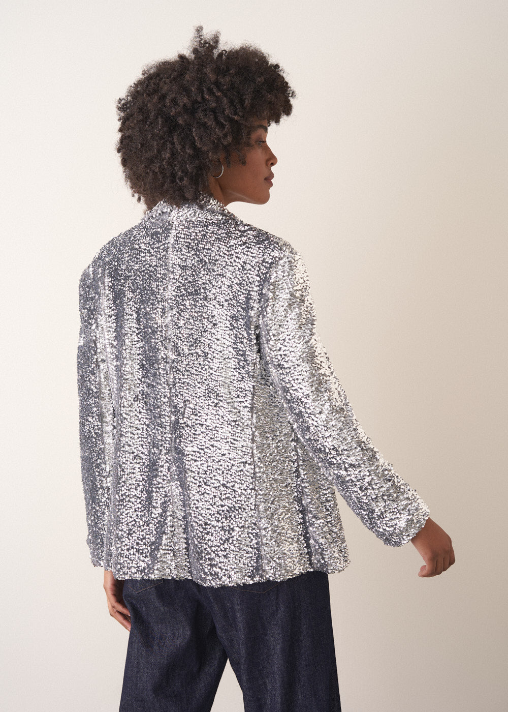 Exuding all out glam, the Wynn Jacket is a must-have statement piece for any party wardrobe. Featuring a relaxed fit, smooth lining, and a dazzling array of silver sequins, this jacket is made for moments that call for maximum sparkle.